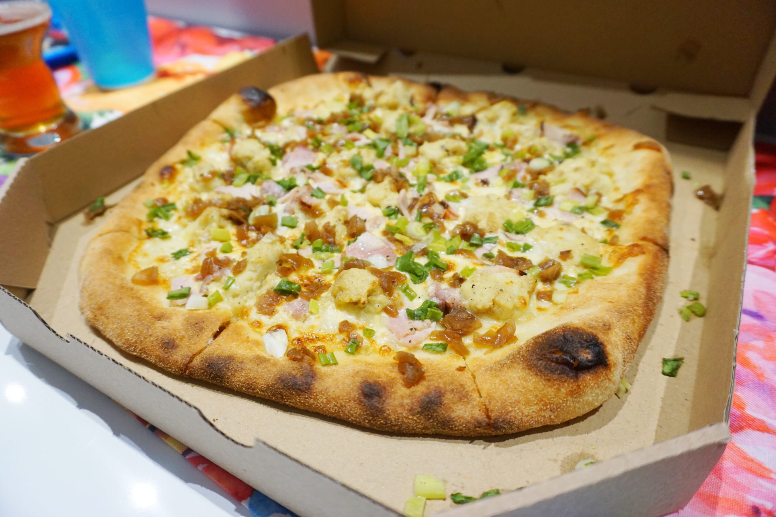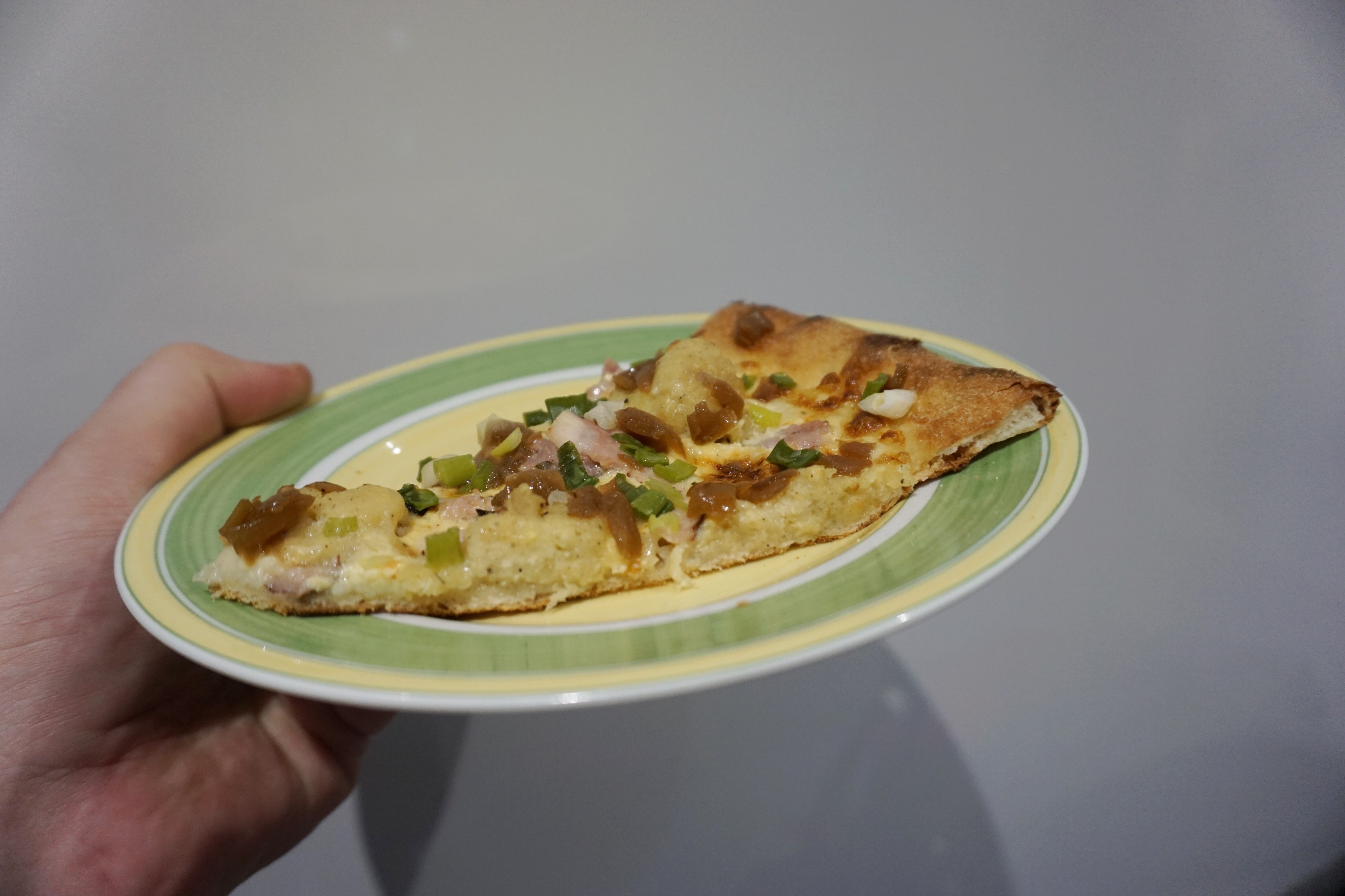 Pierwsza sprawa – pizza na miejscu na pewno smakuje lepiej, to niewątpliwe, głównie ze względu na ciasto, które jest bardziej chrupiące i sztywne, ale tym oczywiście Ameryki nie odkrywam, wiadomo od zawsze. Mimo to, Rusałka po prostu rozbija bank. Połączenie boczku, białej kiełbasy, cebulki, szczypiorku i farszu do pierogów ruskich wygląda mi na najlepszy zestaw na pizzy, jaki może się zdarzyć. Mocno pieprzne połączenie twarogu i ziemniaków nadaje charakteru, podpieczony bekon podkręca smak, a śmietanowy sos zapewnia gładkość. Włosi mogliby się złapać za głowę widząc taką pizzę, ale to coś najlepszego, co może zdarzyć się w pizzy na dowóz.
