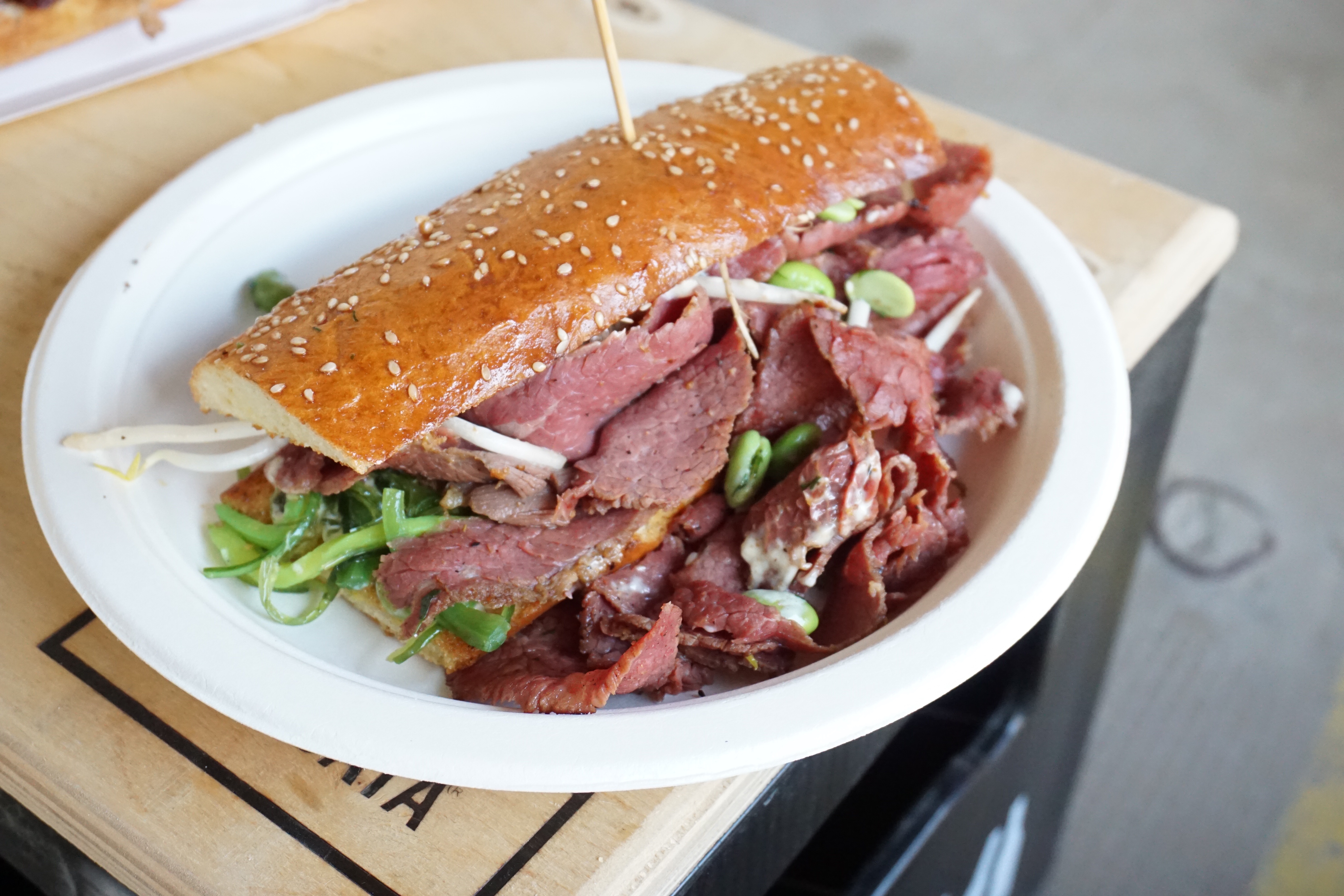 Plastrami przygotowało swoje pastrami w azjatyckiej oprawie, bo właśnie azjatyckie klimaty był tematem przewodnim tych Gastro Nocek. Kompozycja z wakame, edamame, kiełkami i dressingiem na bazie ogórka. Całość wyglądała apetycznie, płaska bułka została wypełniona sporą ilością mięsa, a także zaskakująco nieźle pasującymi dodatkami, choć Azja i pastrami wcale nie znajdują się na jednym kulinarnym biegunie. Śmiało mogę powiedzieć, że to najlepsza z trzech wspomnianych w tekście pozycji. Plastrami wygrało rywalizację jakością mięsa, choć i w tym wypadku mam pewne uwagi. Wydaje mi się, że mięso mogłoby być grubiej skrojone, co pozwoliłoby lepiej wyczuć jest strukturę. Raczej nie zrobiło mu dobrze dość długi czas, jaki spędziło na grillu przed podaniem, przez co na pewno trochę wyschło, choć i tak było przyjemnie soczyste, a przede wszystkim w końcu dało się wyczuć pełnię smaku, jaką oferuje wołowina i zestaw przypraw.