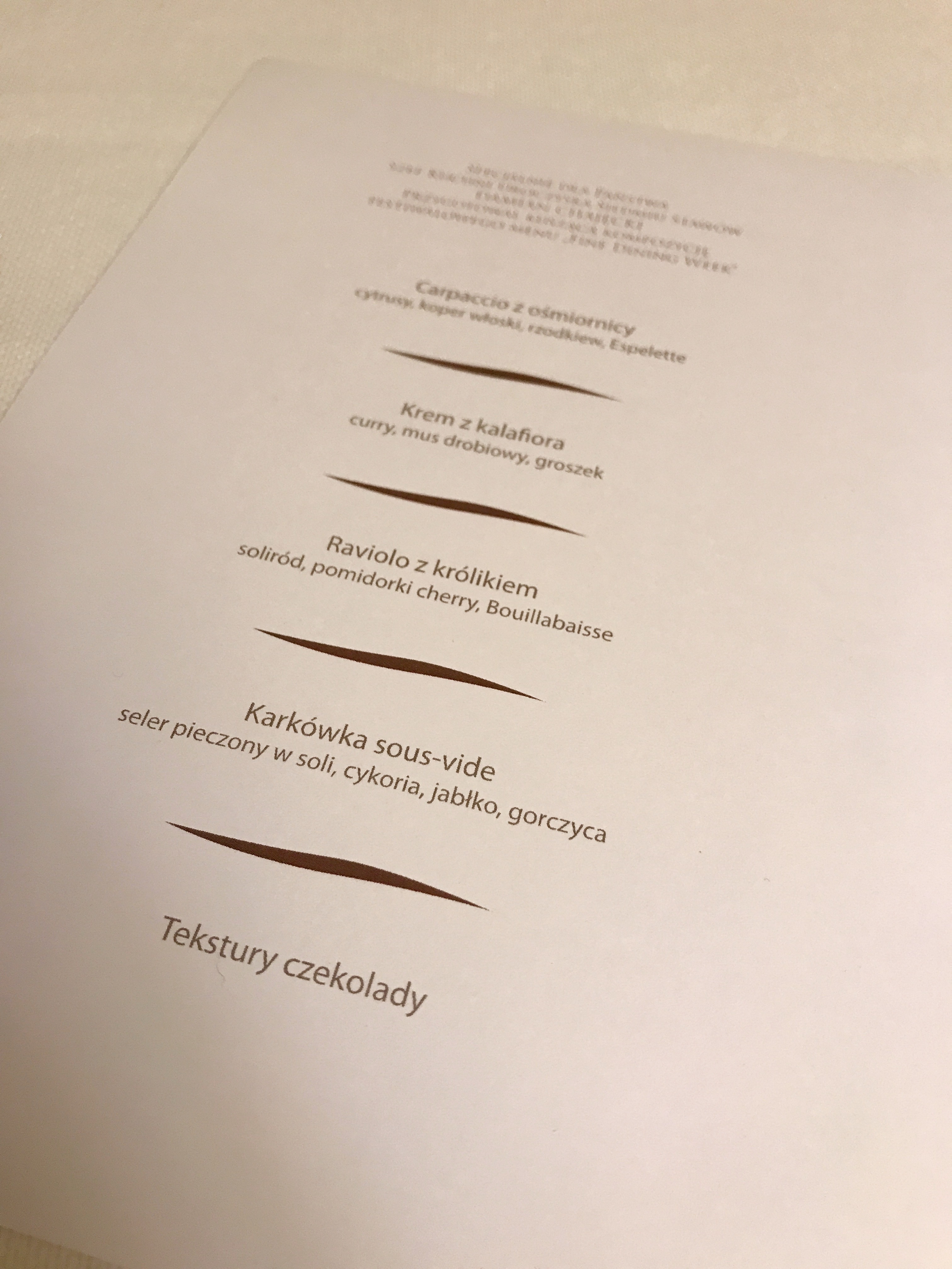 Po jednym obiedzie, wymoczeniu się na basenie i chwili odpoczynku, przyszła pora na właściwą kolację w ramach festiwalu Fine Dining Week, będącego naturalnym przedłużeniem Restaurant Week, tyle że w wersji nieco bardziej eleganckiej. Kwota takiej kolacji dla jednej osoby to koszt 119 zł, co pamiętając o cenach w finediningowych restauracjach, gdzie ceny za degustację rozpoczynają się raczej od 250 zł, to przyzwoita opcja, aby rozpocząć przygodę z taką formą kuchni. Choćby w kwestii ciekawostki.