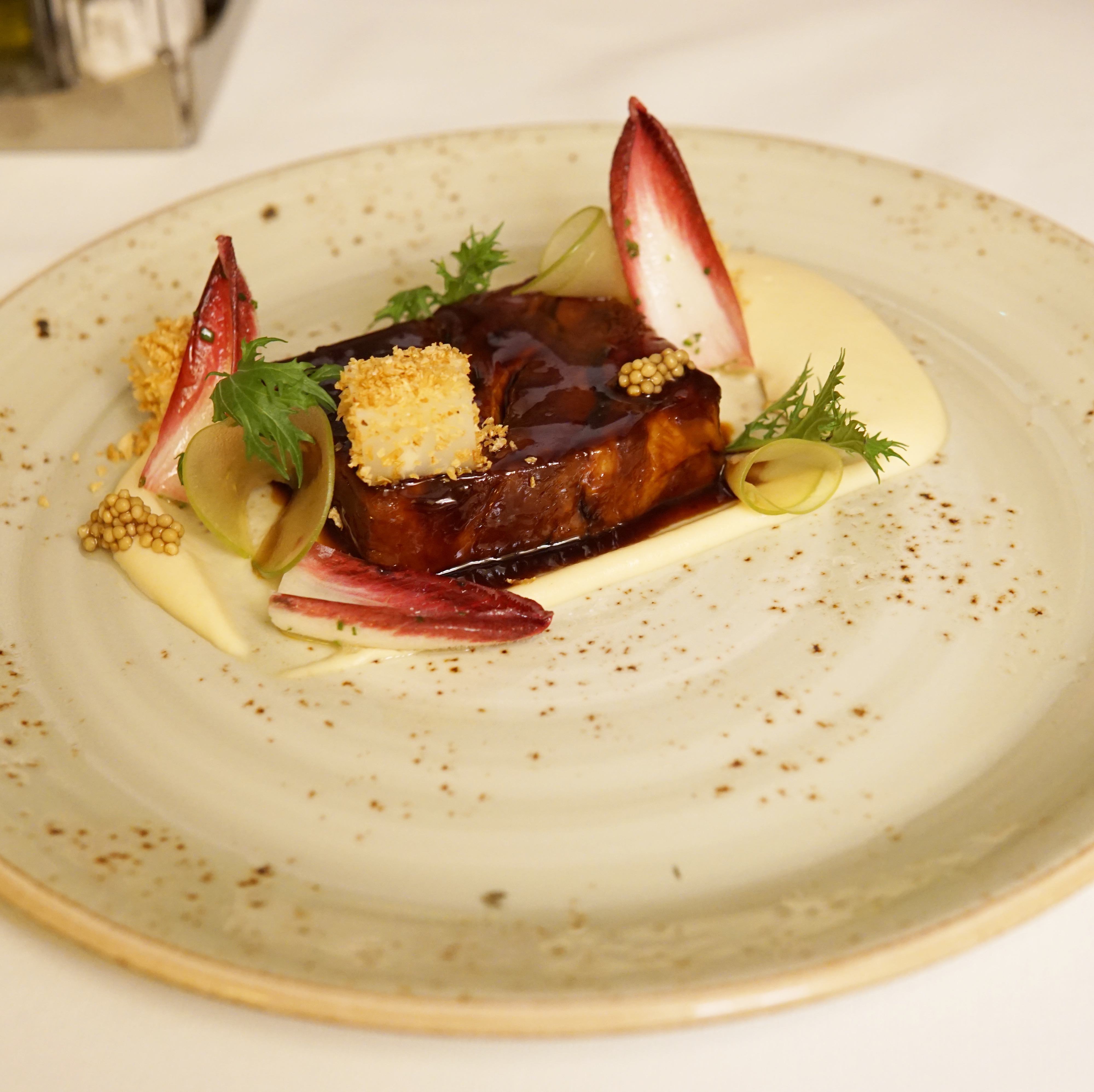 Za to raviolo z królikiem pozwala spełnić mokre sny na temat tego dania. Ciasto idealne, miękkie, odpowiednio sprężyste, naładowane pełnym smaku farszem z mięsa o niemalże kremowej fakturze. Potwierdza spore umiejętności Szefa Kuchni, a talerz uzupełniają trochę przesadnie octowe pomidorki cherry oraz charakterne, dobrze kontrujące lekkość królika rybne bouillabaisse. Jeszcze lepiej wypada karkówka sous vide z cudownie aksamitnym sosem. Mięso rozpływa się w ustach, a seler w dwóch postaciach tylko podkreśla jego moc. Wielkość porcji sugerowałaby raczej na polską odsłonę fine diningu, na zasadzie – ważne, żeby talerz nie był zbyt pusty. Piszę to bez złośliwości, a jedynie z dbałością o swój żołądek, który już w połowie drugiego dania głównego powoli dawał sygnały, że pora kończyć to ucztowanie. Na to jednak nie było czasu, ponieważ przed właściwym deserem, wjechał jeszcze predeser.