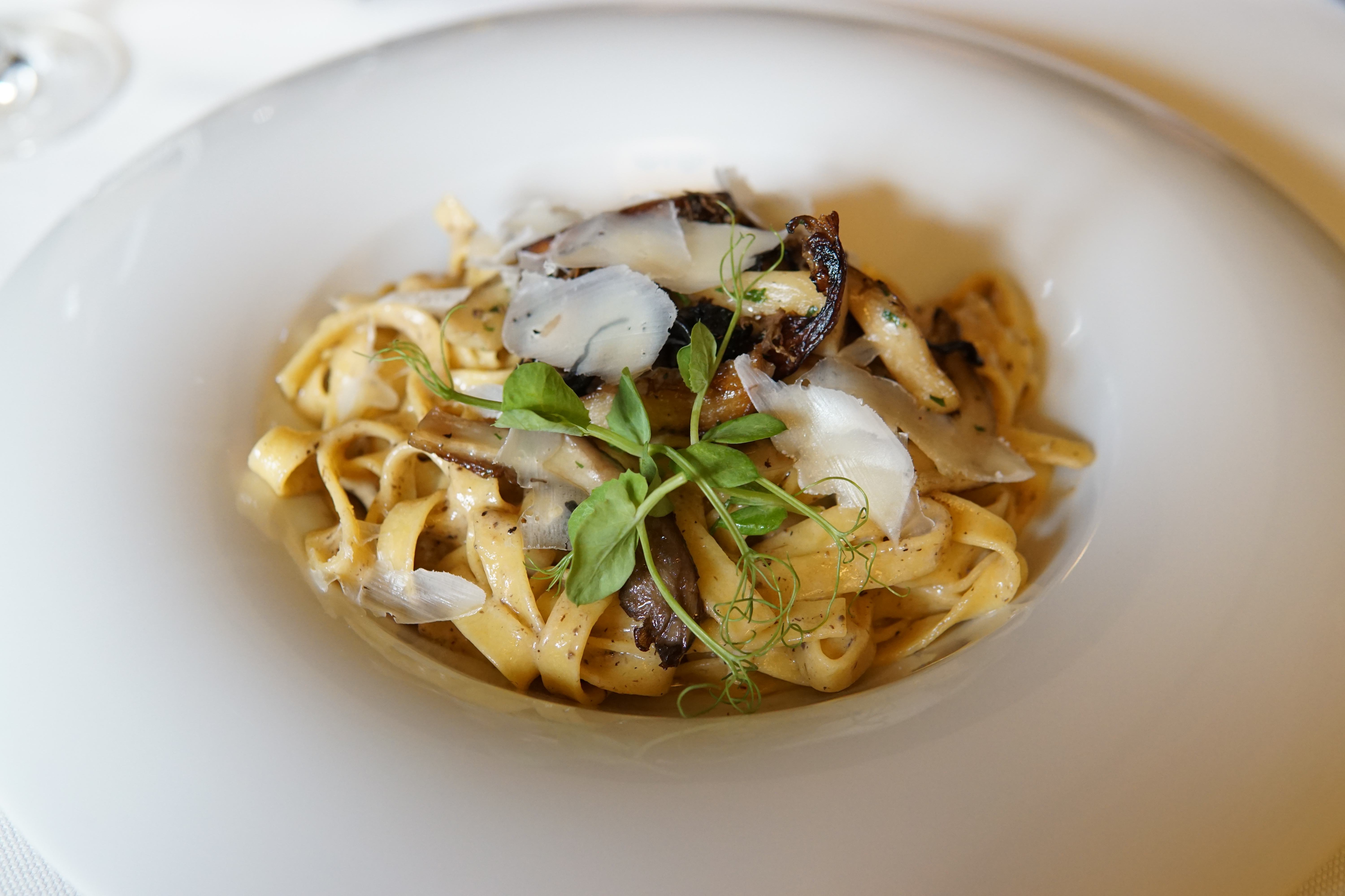 Na początek otrzymujemy pieczony na miejscu chleb z solonym masłem. Doprawdy świetne pieczywo, nie za suche, konkretne. Nie lada gratką dla miłośników jedzenia jest intensywny w smaku kark z dzika z karmelizowaną gruszką, pietruszką, kasztanami oraz gratin z wędzoną śliwką. Estetyka podania na tak, jakość również, podobnie jak i ogrom skondensowanych aromatów na centymetr kwadratowy. Poszliśmy też w opcję banalną wydawałoby się, bo w tagliatelle z grzybami leśnymi, truflami i parmezanem. Rozumiecie ten skład? Umami w czystej postaci, do tego przygotowywany na miejscu makaron. Do tej pory zdarza mi się o nim śnić, a to niby tylko makaron.