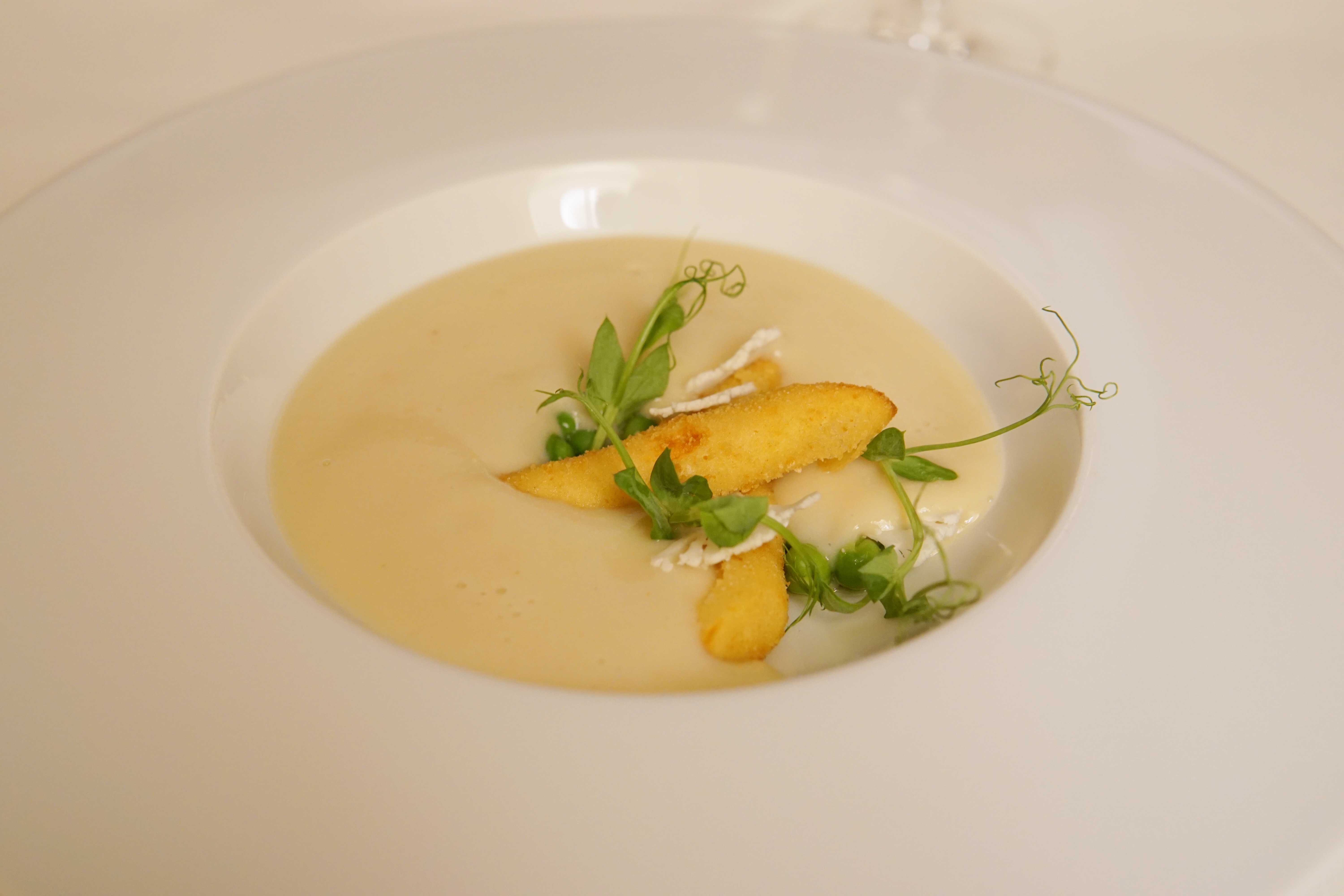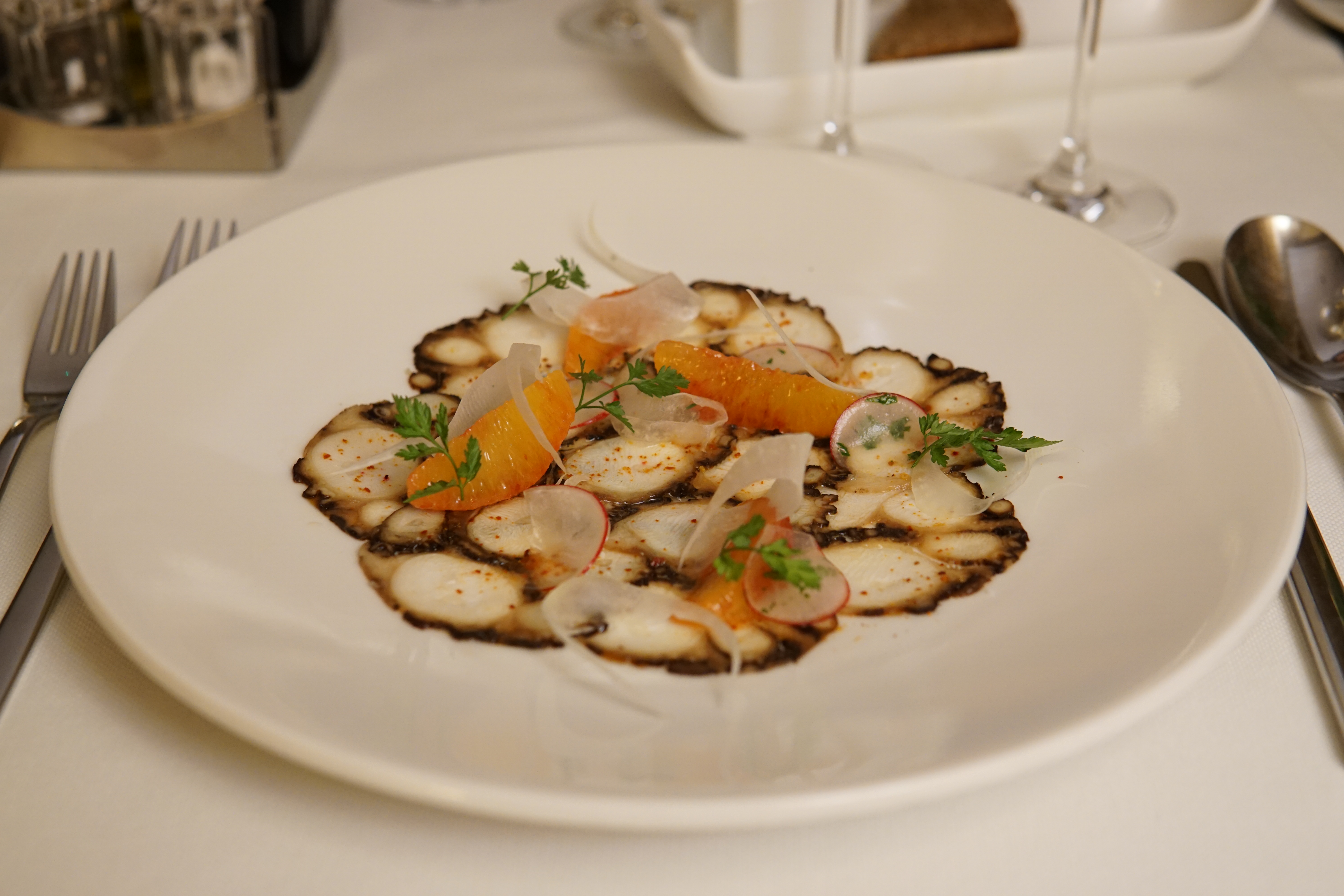Carpaccio z ośmiornicy w cytrusowym klimacie z pieprzem espelette przyjemnie nastraja przed dalszą częścią degustacji. Cieniutko skrojona, niemal przeźroczysta ośmiornica właściwie rozpada się podczas każdego dotknięcia sztućców, a powiązanie z cytrusami przywołuje na myśl wspomnienie o ceviche, tworząc smakowitą, orzeźwiającą kompozycję. Krem z kalafiora to zupa o niezwykle gładkiej teksturze, pełna smaku, choć odnoszę wrażenie, że raczej nie do końca na poziomie oczekiwanym od fine diningowej kolacji.