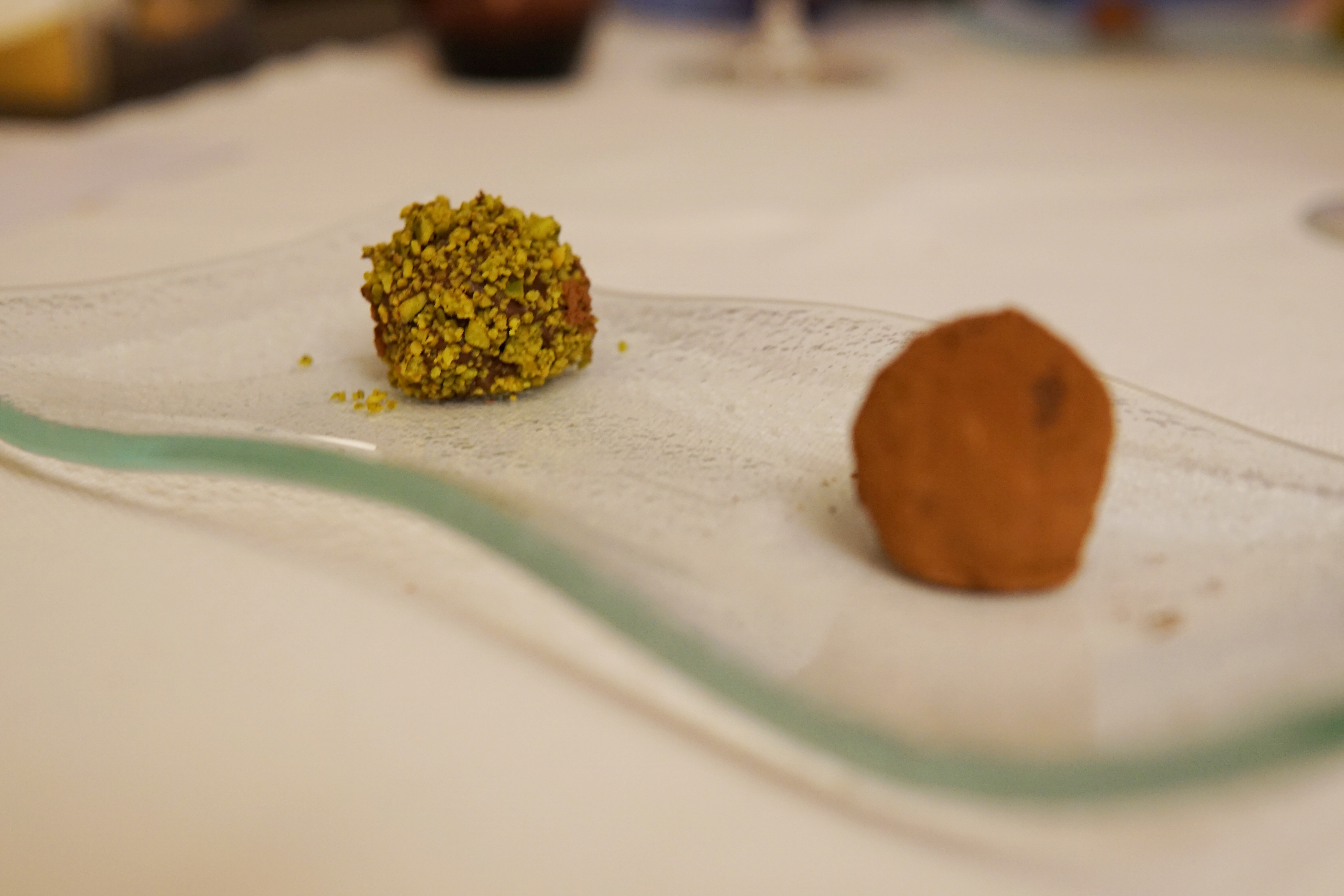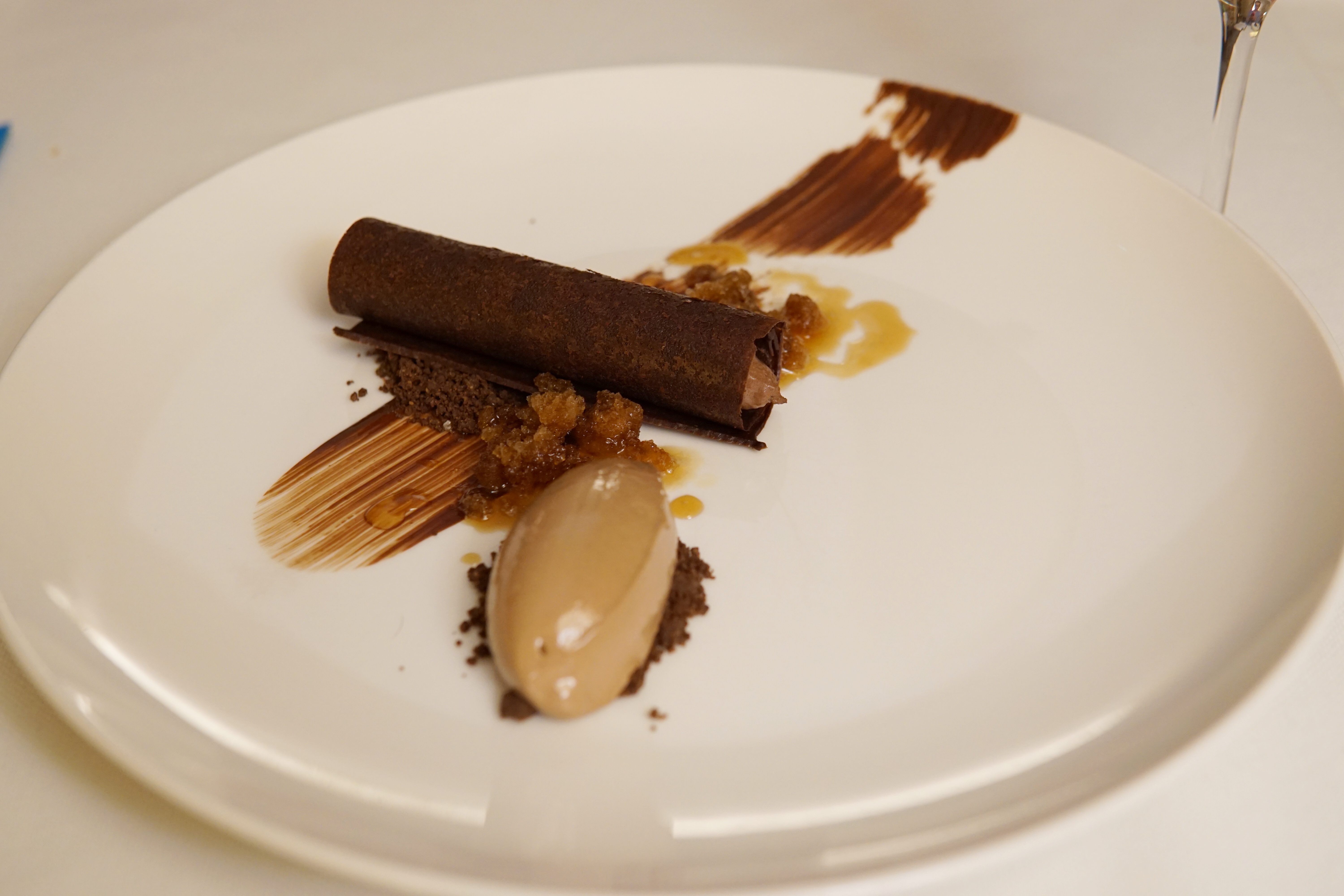 Obie słodkie pozycje kończące kolację był wariacjami na temat czekolady. Ale wbrew pozorom wcale nieprzesadnie słodkimi, dobrze zbalansowanymi, w skład których wchodziły m.in,. praliny, krucha rurka, krem czy lody.