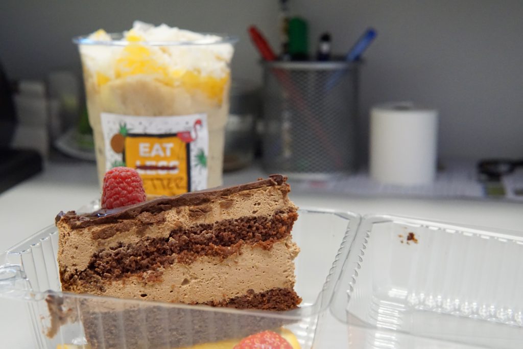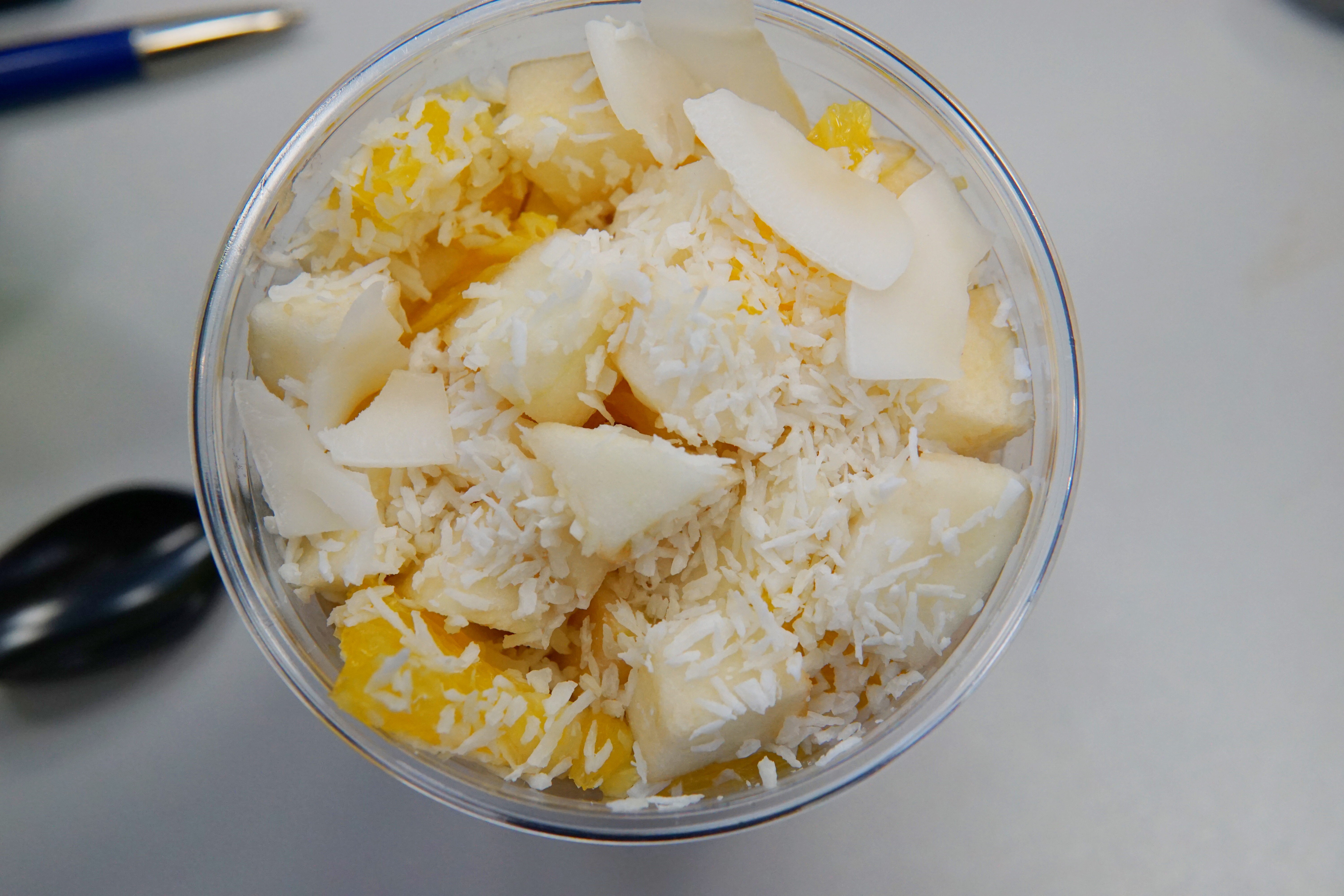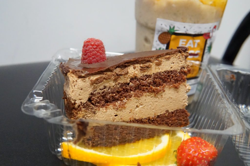 W środku tygodnia zrobiłem sobie mały dzień dziecka i zamówiłem z jednej strony ciasto z kremem (17 zł). Obłędnie pyszne, a moja ocena wynika głównie z tego, że nie było przesadnie słodkie i nie zamuliło od samego rana. Dobrze jest tak zacząć dzień, przyznajcie sami. Nawet jeśli to ciasto bez cukru, laktozy i wegańskie. Starczyło mi na tyle, że druga rzecz z zamówienia – coconut bowl (19 zł) posłużył jako podwieczorek, a właściwie to wstęp do obiadu. Bardzo pożywny, wypchany owocami, z kawałkami jabłek, kokosa i ananasa, ponownie nieprzesłodzony, a raczej orzeźwiający. Fajne uderzenie witamin i świeżości, zwłaszcza na zimno.