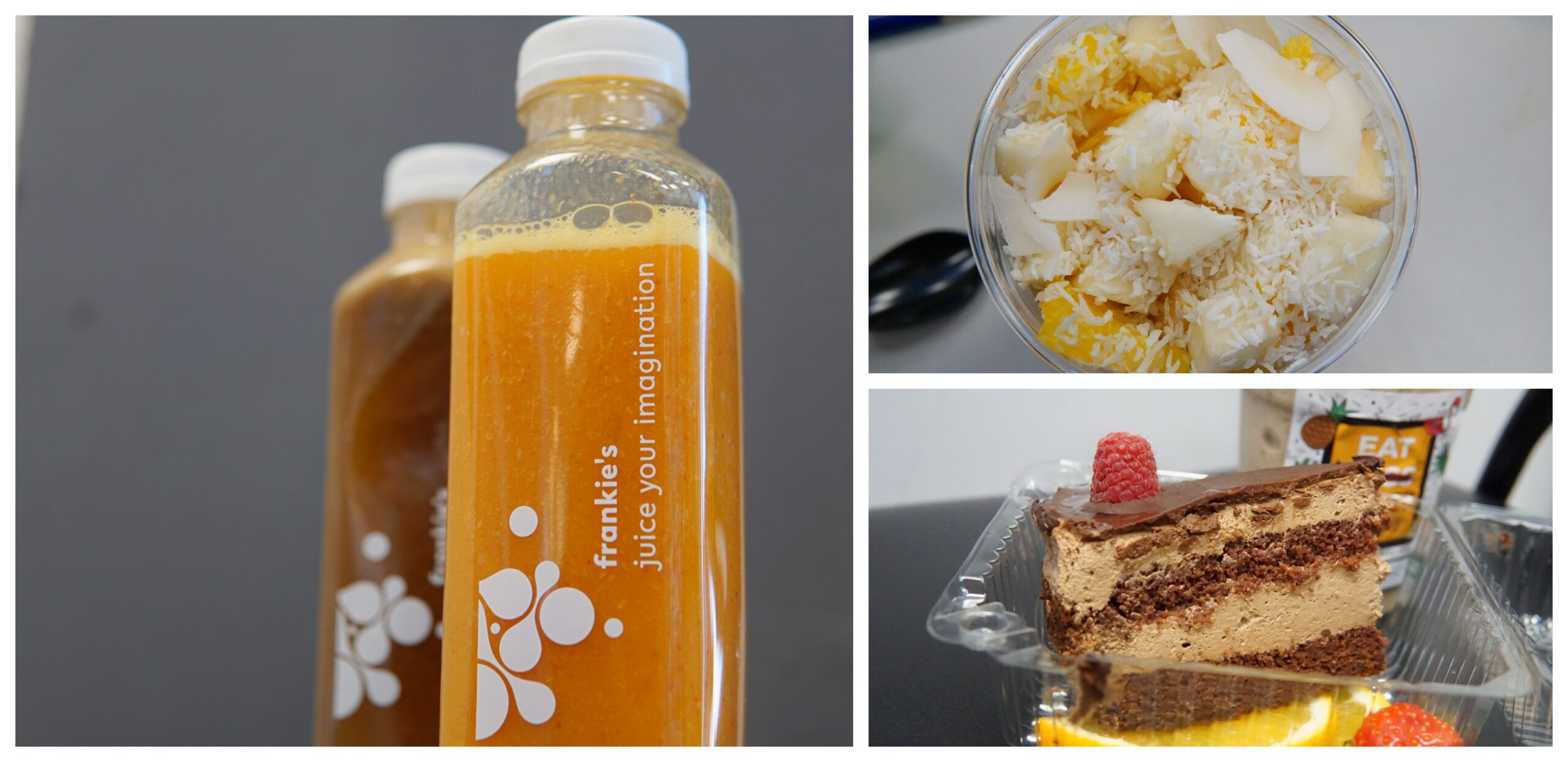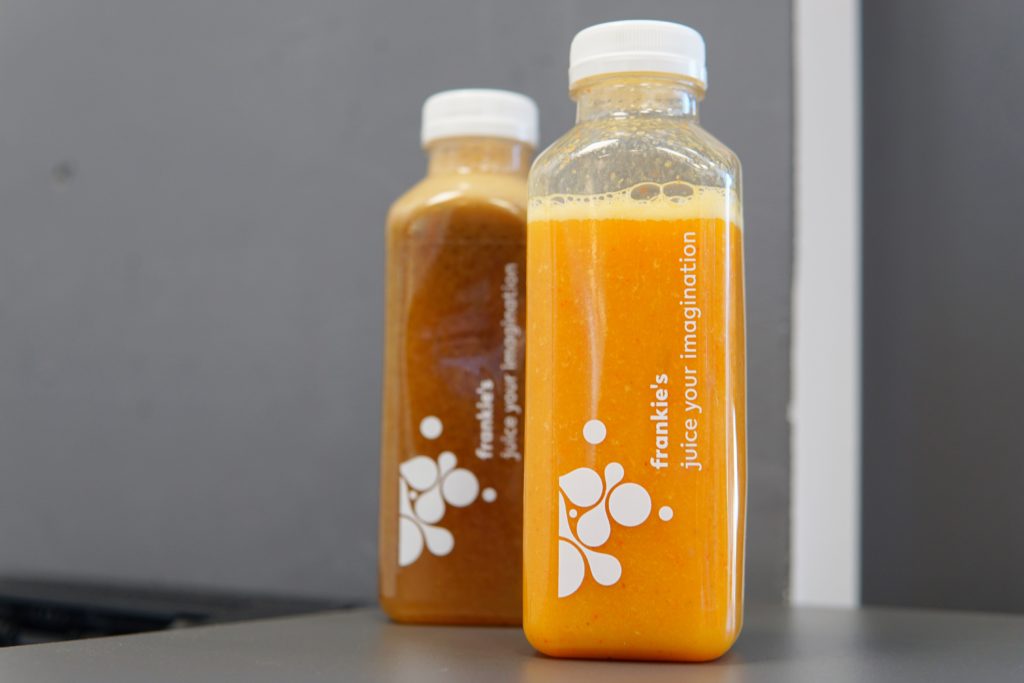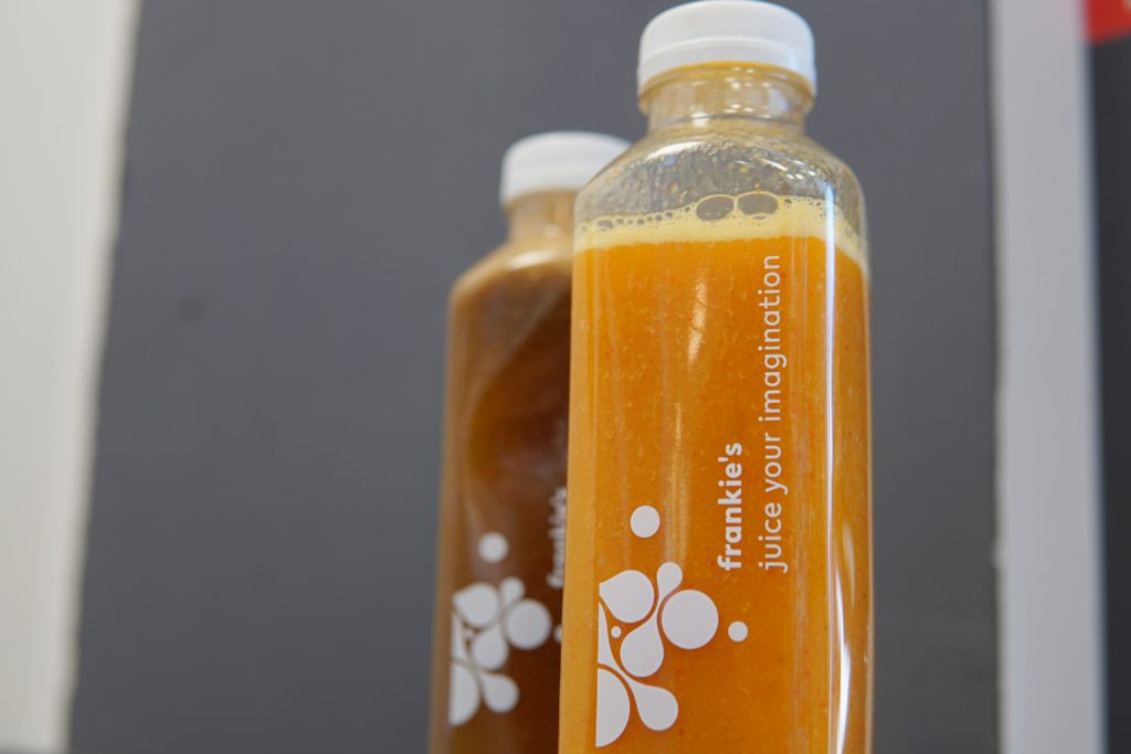 Na drugie uderzenie, kilka dni później, poszedł znany mi dobrze Frankie’s. Ich napoje pijam stosunkowo często, bo pasują mi te buteleczki z możliwością zamknięcia i napicia się później. Wybrałem dwie opcje odświeżające, w sam raz na stan zmęczenia po weekendzie. Jungle Joy (18,50 zł) to chyba moje ulubione połączenie – mango, marakuja, pomarańcze i na dokładkę jagody goji. Jest kwaśno, ale ze słodką nutą, jest rześko i bardzo owocowo, a marakuja jak zawsze daje nie tylko piękną barwę, ale i uderzenie mocy. Jestem fanem i wiem, że w najbliższym czasie będzie to mój numer jeden. Lemonizer (17 zł) prezentuje z kolei dość klasyczne podejście do tematu. To właściwie taka lemoniada z cytryn i jabłek z dodatkiem mięty. Jest aromatycznie, niemalże wykręca buzię od kwasu, ale to właśnie smak, jakiego potrzebuję nad ranem.