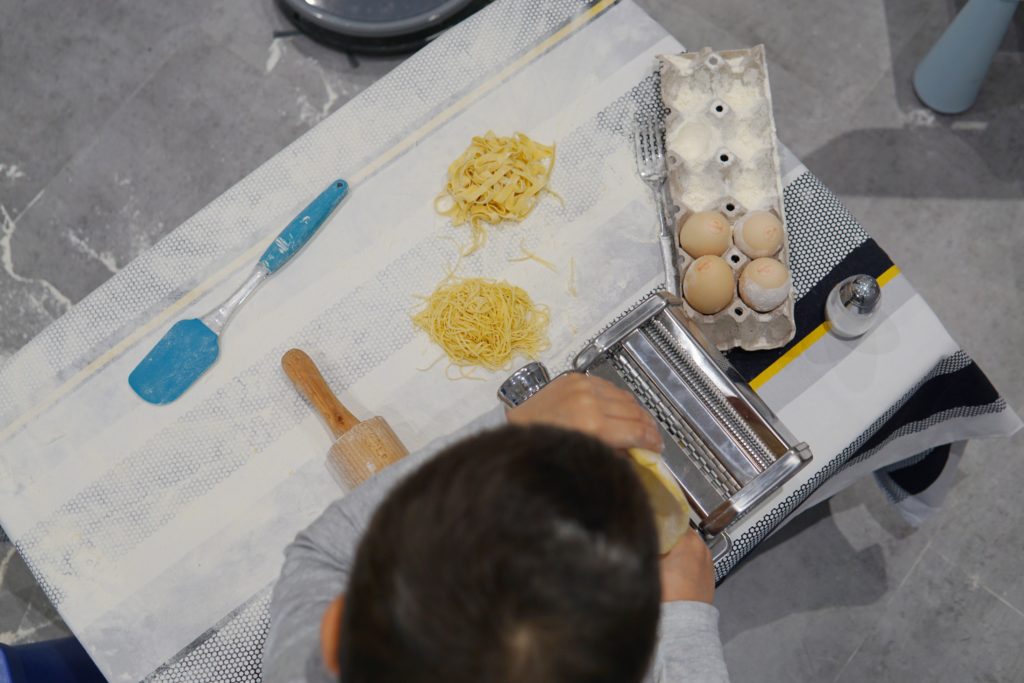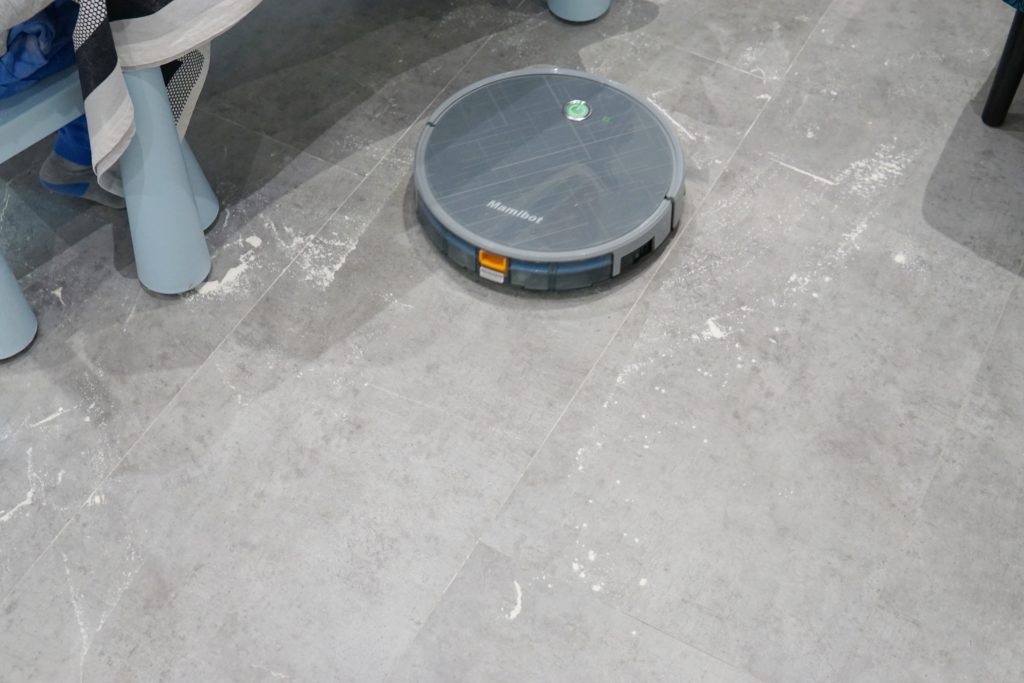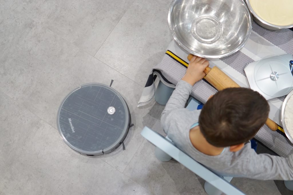 Przechodzimy do spędzającego sen z powiek clue programu, a więc elementu, który dla wielu stanowi główny problem i nie pozwala rozluźnić się w trakcie zabawy w gotowanie z dzieciakami – sprzątania. Przyznam, że o ile faktycznie uwielbiam gotować, tak sprzątanie idzie mi kiepsko, a umówmy się, na ziemi ląduje zawsze mnóstwo rzeczy. Zwłaszcza, jeśli damy młodym do rąk takie narzędzia zbrodni jak mąka, ryż, obierki. Zdradzę Wam, że nasze problemy odeszły jak ręką odjął, kiedy zaadoptowaliśmy kolejnego domownika – robot sprzątający Mamibot Grey. Właściwie śmiało mogę Wam powiedzieć, że od tego momentu gotujemy z dzieciakami częściej. Mając z tyłu głowy komfort posiadania odkurzacza, który przy pomocy dwóch kliknięć w aplikacji przyjeżdża i wymiata samodzielnie każdy brud, wręcz dajemy czasami zgodę na luźniejsze podejście do tematu i młodzi mogą sobie pozwolić na chwilę nieuwagi.