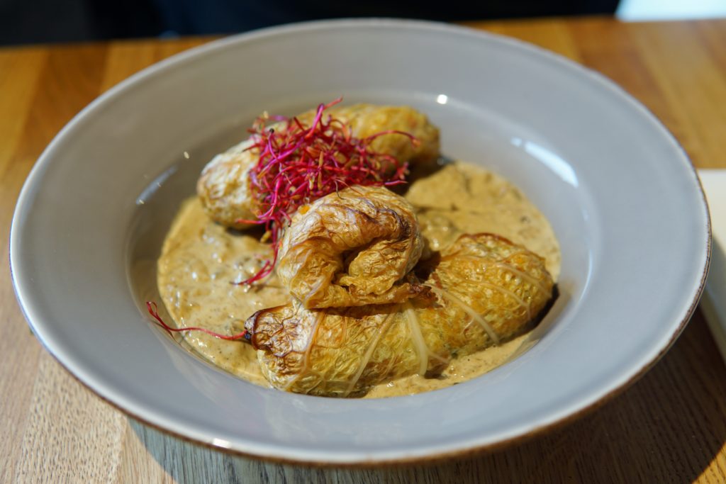 Duże oczekiwania, podbite również efektem wizualnym na talerzu, mieliśmy względem gołąbków (20 zł) z kaszą bulgur, ciecierzycą i warzywami w sosie borowikowym. Te borowiki to chyba lekko po sezonie, ale co tam. Nie to jest największą wadą tego zestawienia. Że wyciągnięcie esencji smaku z warzyw nie jest prostą sprawą przekonało się już wielu Szefów Kuchni, ale żeby zrobić coś tak kompletnie pozbawionego smaku, jak te gołąbki, to trzeba mieć talent. Wewnątrz znaleźliśmy kaszę, soczewicę, suszone pomidory, seler, marchewkę – przyznacie, że dość specyficzny wybór. Można to było ubrać w wiele różnych szat – od klimatów arabskich aż po polską klasykę, a zdecydowano się na najgorszą z opcji, czyli niedoprawione warzywa w leciutkim sosie na poziomie baru mlecznego. Kwintesencją i pewnego rodzaju kropką nad i całej nijakiej uczty okazał się burger z polikiem wołowym (27 zł). Umówmy się, temat oklepany od lat. Tak na oko trzydniowa, wysuszona bułka, ponownie rukola (oczywiście bez wzmianki w menu), ogórek kiszony raczej drugiego sortu z charakterystyczną skarpetową nutą, sos na zasadzie – miks ketchupu z majonezem i najlepsza – co nie znaczy dobra, z zestawienia – konfitura z czerwonej cebuli, która z konfitury z czerwonej cebuli posiadała tylko cebulę. Mięso owszem, rozpadające się, ale ustalmy jedno – zrobienie rozpadającego się polika w 2019 roku to trochę za mało. Polik wrzucono do bułki samodzielnie, bez żadnych płynów, przez co raczej dało się wyczuć wspomnianego kiszonego, niż cokolwiek innego. Cztery gryzy i do boksu, bo szkoda tracić czas.
