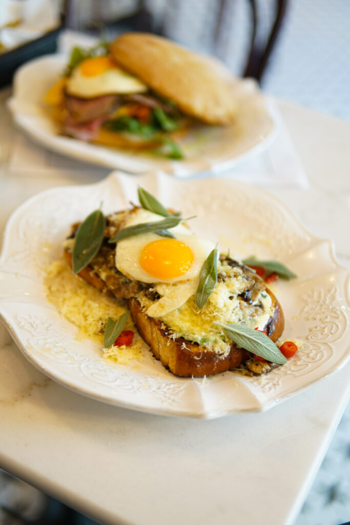 Co na śniadanie? Wchodzę w kanapkę vintage cheddar (34 zł) i w tym wypadku mam tylko pozytywne wrażenia. Delikatna chałka, lekko przesmażony szpinak, pieczarki, ciągnący się ser, jajko sadzone, a do tego zaskakująca, ale i zaskakująco dobrze grająca szałwia. Ma to wszystko smak, ma delikatnego kopa ze względu na dodatek chili, no i ma na pewno sporo kalorii. Ale co tam. Jedynie samo pieczywo mogłoby być trochę bardziej zgrillowane, aby struktury poszczególnych składników się różniły.