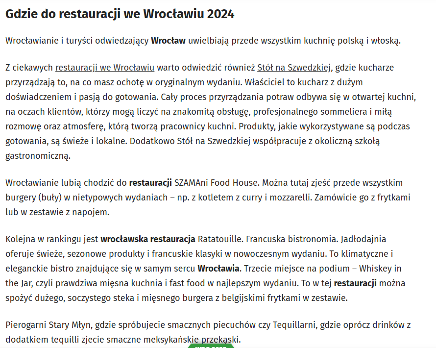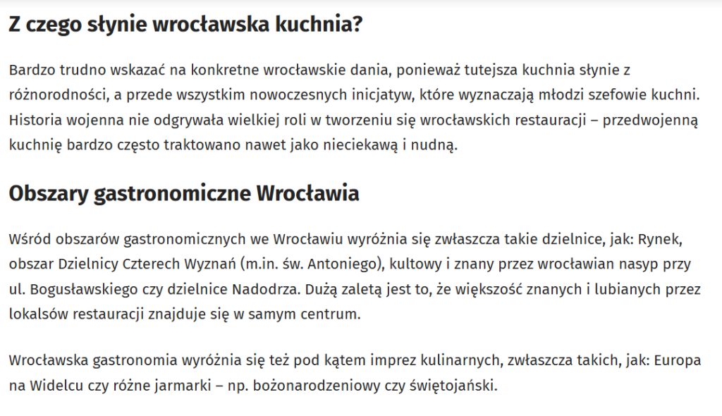 Dowiadujemy się z tejże strony m.in. o tym, że wrocławska gastronomia wyróżnia się na tle innych dzięki jarmarkowi oraz Europie na widelcu, która już nie istnieje. A że ktoś totalnie losowo promuje francuską knajpkę Ratatouille, która to… już od dawna nie działa. A co tam! Kolejny strzał w kolano, bo jeśli ktoś przez przypadek trafi na te bzdury, na pewno nie trafi do najlepszych gastro miejsc w mieście.