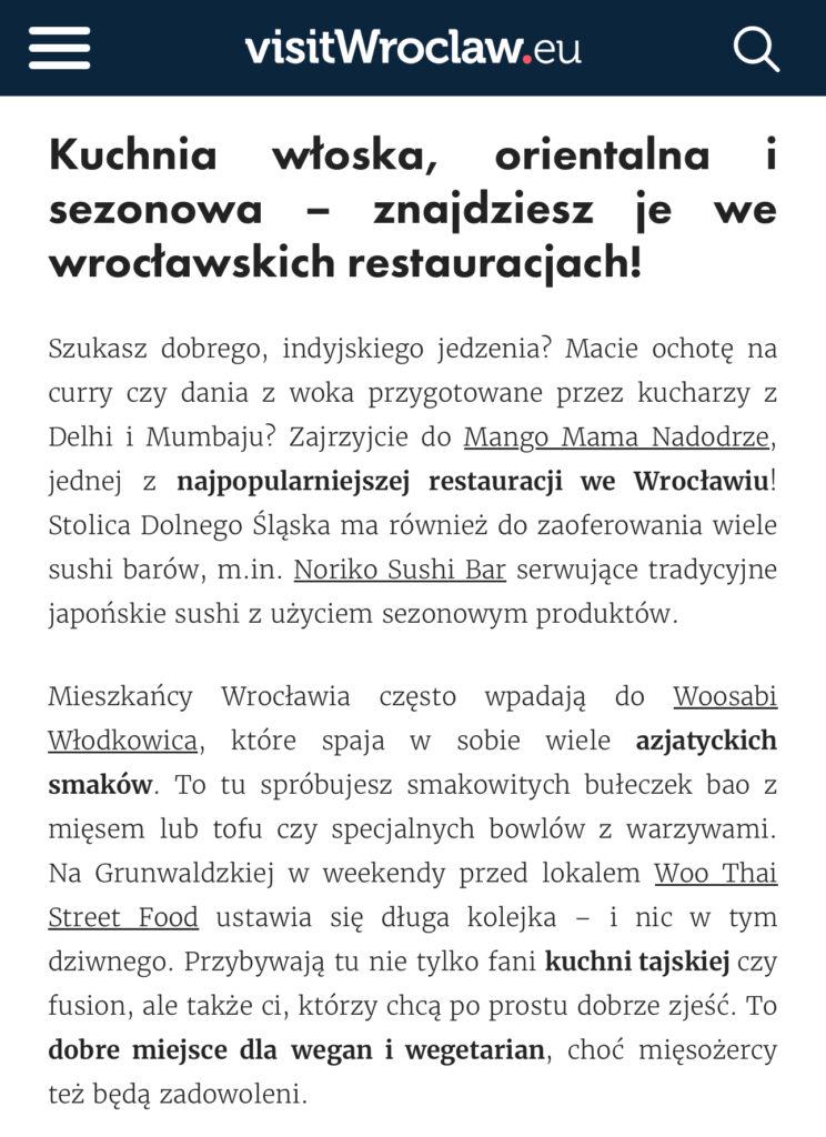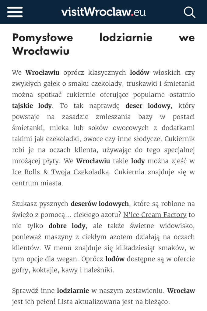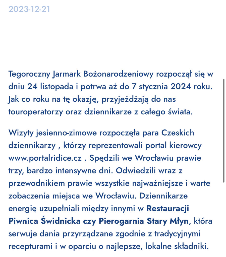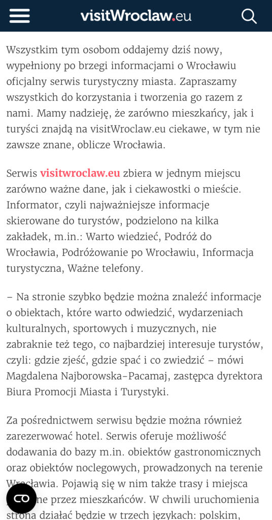Zresztą visitwroclaw.eu to kopalnia niekompetencji urzędników zajmujących się prowadzeniem strony mającej być w założeniu oknem wystawowym miasta na turystów. Brak aktualizacji, losowo dobrane miejsca wpisane bez ładu i składu, teksty promujące zamknięte dawno lokale, a także takie, które brzmią niczym stworzone przez Chat GPT.