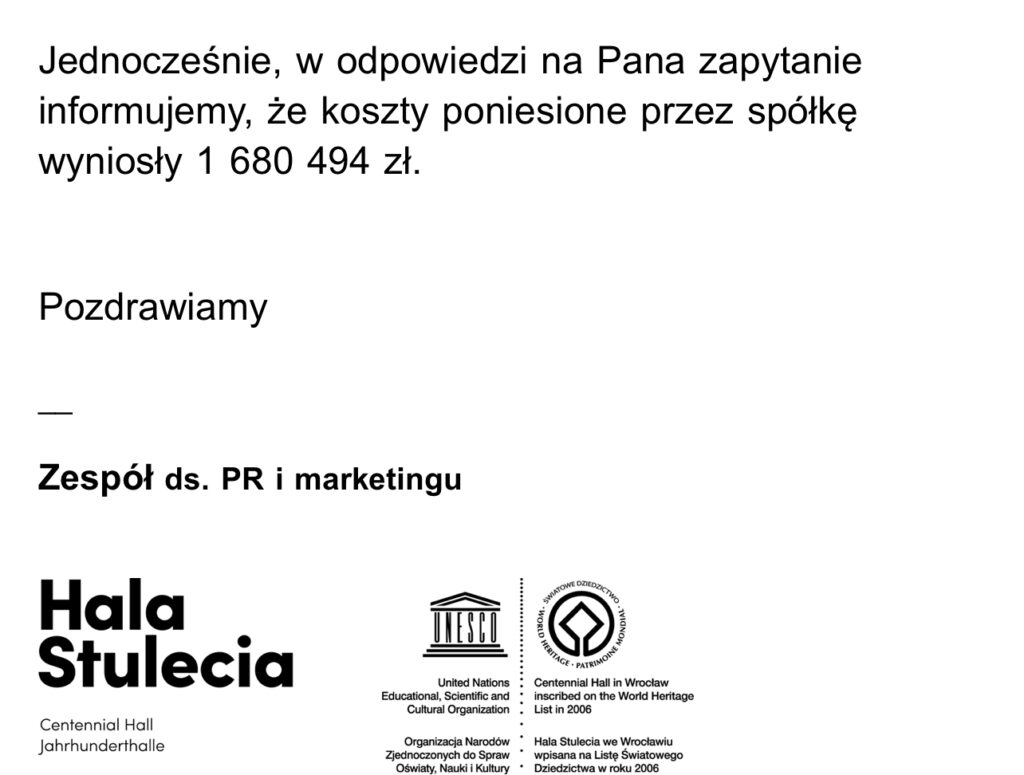 Ile podatników kosztowała restauracja Tarasowa? Po zadaniu pytania otrzymałem informację zwrotną w tym temacie: